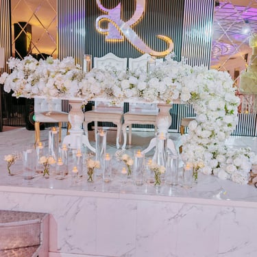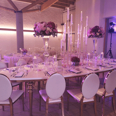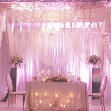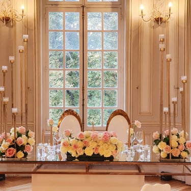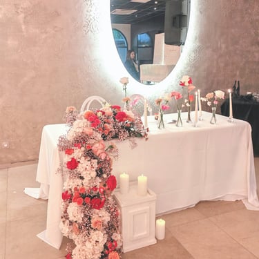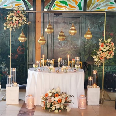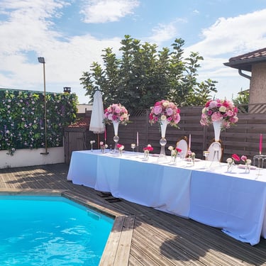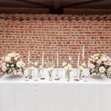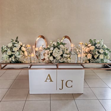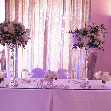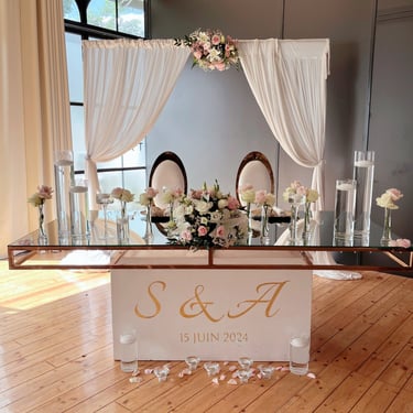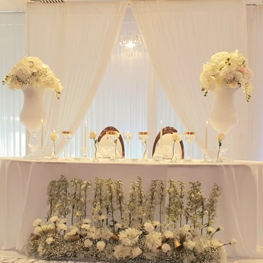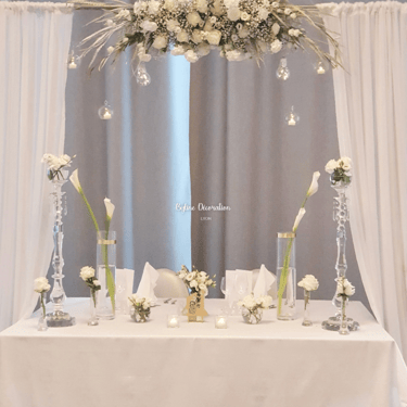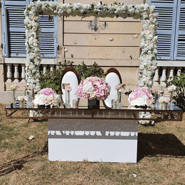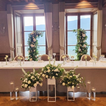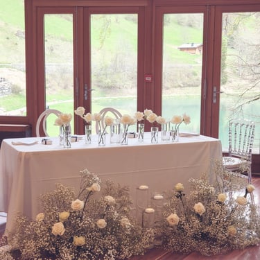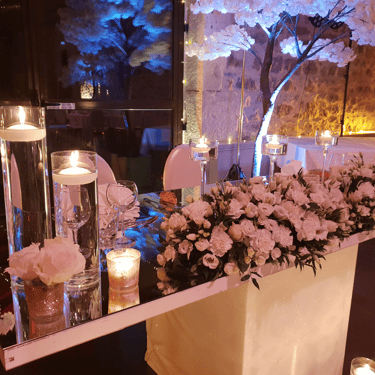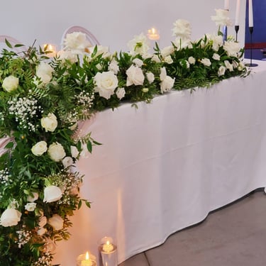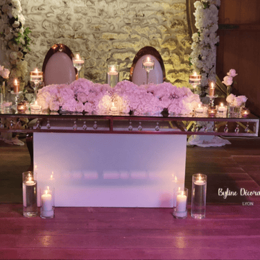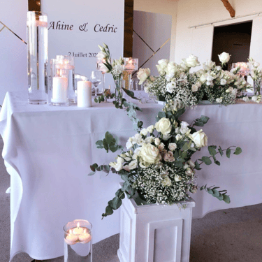 Chenille florale longue ou deux compos hautes et une petite centrale incluant les deux centres de tables plusieurs de bougies et petits pots de fleurs, 2 chaises mariés = 250€